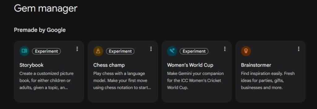 The “Gem manager” screen serves as the central hub for all your specialized assistants. Here, you can access pre-made Gems from Google, view and launch your own creations, and find any Gems that have been shared with you. This provides an organized and easily accessible library, ensuring your custom AI tools are always just a click away.