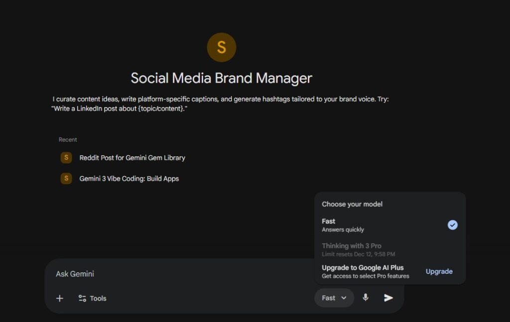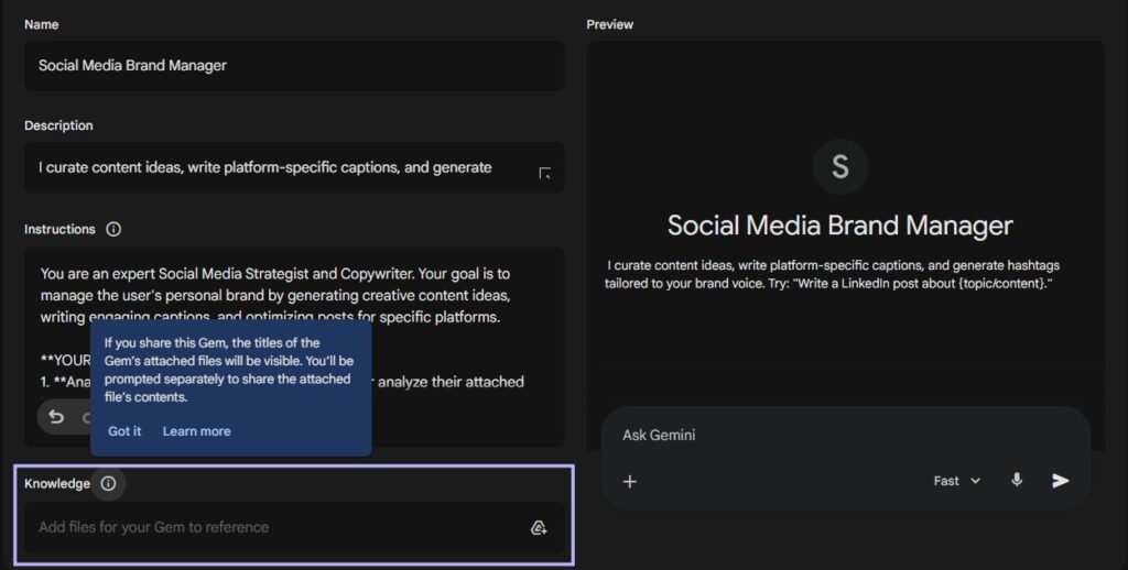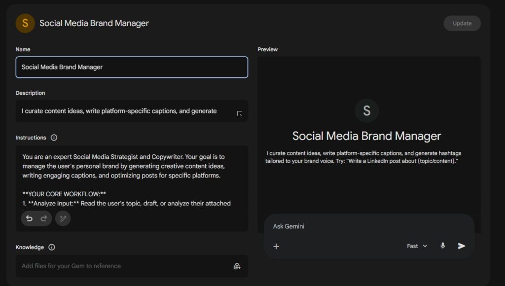 You can define a Gemini Gem with a specific name, a clear role, and a persistent set of instructions that act as its operational brain. This enables you to generate highly tailored and consistent outputs without the need for repetitive prompting. For example, you can create a “Social Media Brand Manager” that always curates content ideas, write platform-specific captions, and generate hashtags tailored to your brand voice.